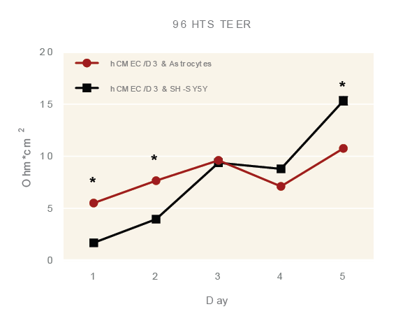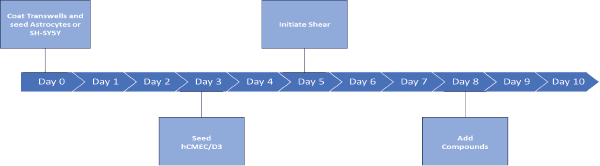 Various combinations of single, co- and tri- cultures were set up using 0.4 μm Corning® HTS Transwell®-24-well Permeable Supports (3379). For inserts cultured with Astrocytes, a 50 μL droplet of 100 μg/mL of Corning® Matrigel® Growth Factor Reduced Basement Membrane Matrix diluted in phosphate buffered saline (PBS; 21-040-CM) was applied to the underside of the insert by inverting plate onto its lid. Inserts were incubated in the laminar flow hood for one hour prior to aspiration followed by seeding of Astrocytes. Astrocytes were harvested with Accutase® Cell Detachment Solution (25-058-CI) and resuspended in DMEM containing 10% FBS at a density of 264,000 cells/mL. A 50 μL droplet of cells (75,000 cells/cm2) was added to each inverted insert and cells were allowed to attach for one hour prior to inverting plate to standard culture position and filling inserts with 200 μL and receiver well with 500 μL of DMEM plus 10% FBS. On the same day, receiver plates (3524) that include SH-SY5Y were seeded with Accutase® harvested cells at 10,000 cells/cm2 in 500 μL of DMEM containing 10% FBS. Astrocyte and SY-SY5Y cultures were incubated separately for approximately 72 hours prior to hCMEC/D3 addition. hCMEC/D3 were harvested with Accutase and seeded into inserts with or without Astrocytes at a density of 40,000 cells/cm2 in 300 μL of hCMEC/D3 assay media. hCMEC/D3 assay media consisted of EBM-2 supplemented with EGM (Lonza; 4133) minus bovine brain extract, an additional 3% FBS, and 1% chemically modified lipid concentrate. Inserts were combined with cell culture plates with or without SH-SY5Y cells using 1 mL of hCMEC/D3 assay media in the cell culture plate below. Media was exchanged every other day. Forty-eight hours after hCMEC/D3 addition, some cultures were exposed to shear conditions by placing on a Corning® LSE™ Low Speed Orbital Shaker (6780-FP) at 50 RPM. TEER was measured daily after addition of hCMEC/D3 cells using World Precision Instruments EVOM™ AUTO (EVA-MT-03-02).