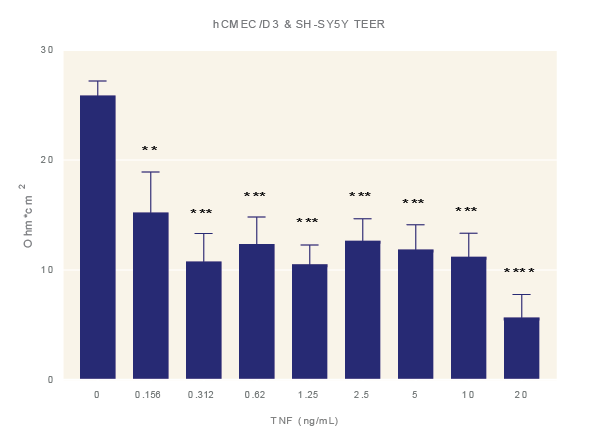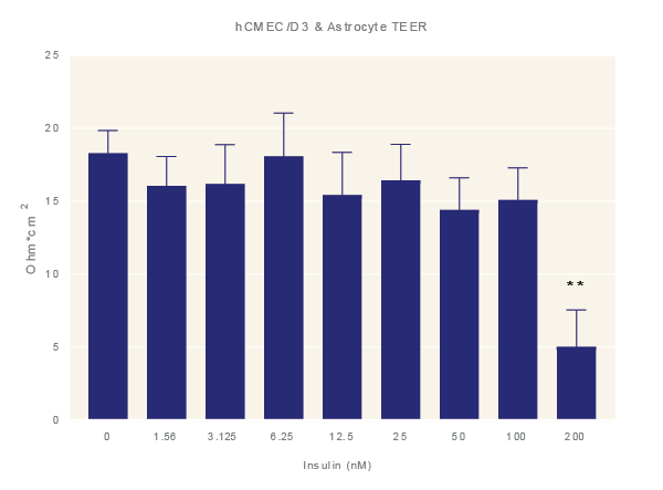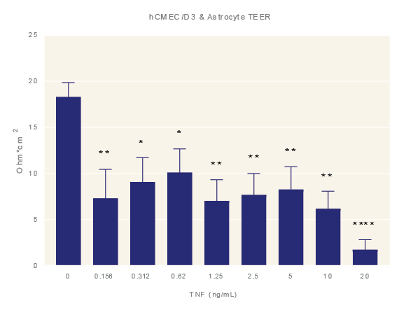 Approximately, 120 hours after hCMEC/D3 addition, media was aspirated from Corning® HTS Transwell® 96 Permeable Supports and replaced with serially diluted Lipopolysaccharide (LPS; Invitrogen; 00-4976-93), Insulin (Thermo Scientific; 12585014), TNF alpha (Thermo Scientific; 300-01A-500 μg) or media as a negative control. Compounds were incubated with cultures on shaker for 48 hours with TEER being measured daily.