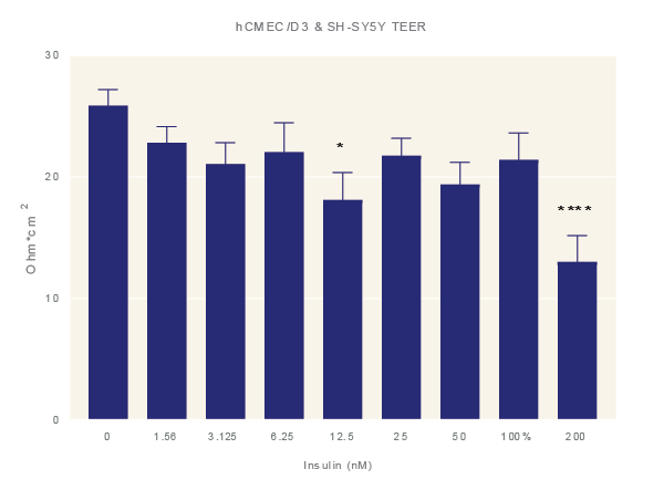 Impact of Insulin. Average TEER measurement of cultures exposure to increasing concentrations of insulin for 48 hours. Data is the average of three technical replicates per experiment and three shown with standard error. ANOVA with Dunnett’s post test in comparison to media only. *=p<0.05, **=p<0.005, ***=p<0.001 ****=p<0.0001.