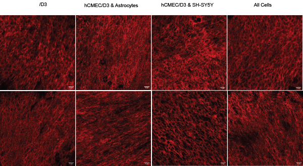Primary human Astrocytes (iXCells 10HU-035) were thawed in Dulbecco’s Modified Eagle’s Medium (DMEM; 10-013-CM) supplemented with 10% fetal bovine serum (FBS; 35-010-CV) and maintained on Corning® BioCoat® Collagen I-coated flasks (354486). A working bank of cryopreserved cells were used upon recovery from thaw or after a single passage to a new collagen coated flask. Neuroblastoma cell line SH-SY5Y (ATCC®; CRL-2266) were maintained in DMEM supplemented with 10% FBS. hCMEC/D3 (MilliporeSigma; SCC066) were cultured on Corning® BioCoat® Collagen I-coated flasks in EBM-2 (Lonza; 3156) supplemented with EGM-2 MV (Lonza; 4147), and additional 2.5% FBS, and 1% chemically modified lipid concentrate (Thermo Scientific; 11905031).