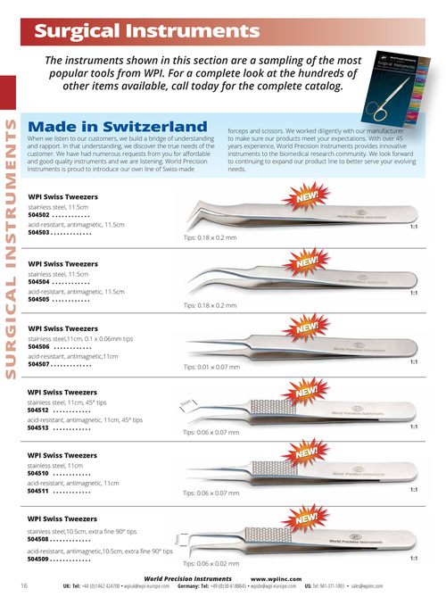forceps and scissors. We worked diligently with our manufacturer to make sure our products meet your expectations. With over 45 years experience, World Precision Instruments provides innovative instruments to the biomedical research community. We look forward to continuing to expand our product line to better serve your evolving needs.