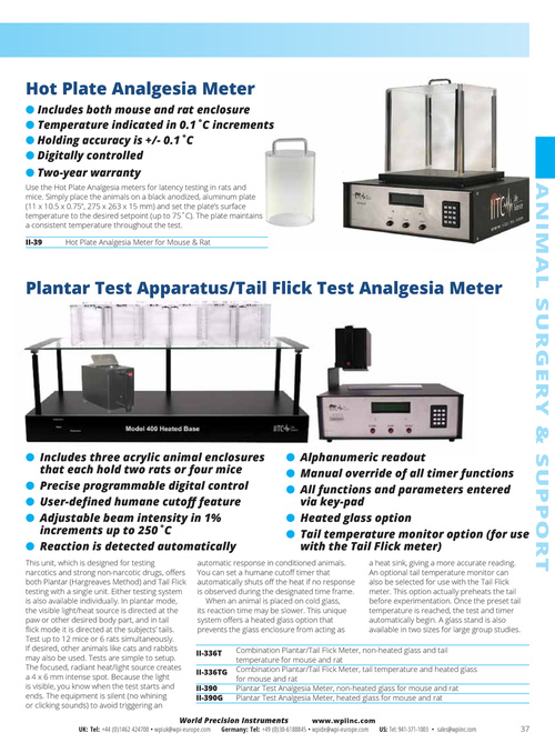 Use the Hot Plate Analgesia meters for latency testing in rats and mice. Simply place the animals on a black anodized, aluminum plate (11 x 10.5 x 0.75”, 275 x 263 x 15 mm) and set the plate’s surface temperature to the desired setpoint (up to 75˚C). The plate maintains a consistent temperature throughout the test. II-39 Hot Plate Analgesia Meter for Mouse & Rat