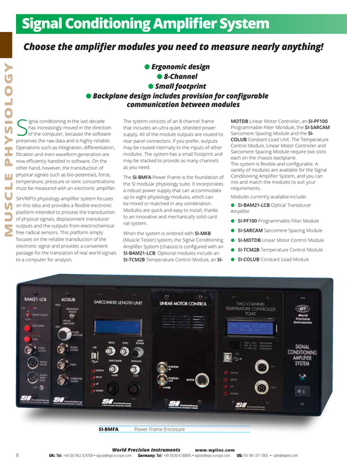 MOTDB Linear Motor Controller, an SI-PF100 Programmable Filter Mondule, the SI-SARCAM Sarcomere Spacing Module and the SICOLUB Constant Load Unit. The Temperature Control Module, Linear Motor Controller and Sarcomere Spacing Module require two slots each on the chassis backplane. The system is flexible and configurable. A variety of modules are available for the Signal Conditioning Amplifier System, and you can mix and match the modules to suit your requirements. Modules currently available include: ● SI-BAM21-LCB Optical Transducer Amplifier ● SI-PF100 Programmable Filter Module ●● SI-SARCAM Sarcomere Spacing Module ●● SI-MOTDB Linear Motor Control Module ●● SI-TCM2B Temperature Control Module ●● SI-COLUB Constant Load Module