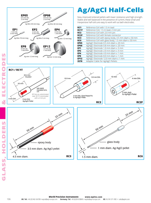 New, improved sintered pellets with lower resistance and high strength. Stable and well balanced in the presence of current, these small and inexpensive half-cells are easy to work with as bath electrodes. RC1 RC1T RC2 RC2F RC3 RC6 EP05 EP08 EP1 EP2 EP4 EP8 EP12 3578 Reference Cell with 1.5 m lead Reference Cell, 1.5 m lead, 2 mm pin Reference Cell with 2.0 mm pin Reference Cell with female connector Reference Cell with epoxy body, 4.5 mm diam x 50 mm Reference Cell with glass body, 1.5 mm diam x 50 mm Ag/AgCl Electrode 0.5 mm diam x 20 mm Ag/AgCl Electrode 0.8 mm diam x 20 mm Ag/AgCl Electrode 1.0 mm diam x 3 mm Ag/AgCl Electrode 2.0 mm diam x 4 mm Ag/AgCl Electrode 4.0 mm diam x 1 mm Ag/AgCl Electrode 8.0 mm diam x 1 mm Ag/AgCl Electrode 12.0 mm diam x 1 mm Adapter Cable for Ag/AgCl Pellets