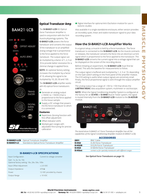 The SI-BAM21-LCB KG Optical Force Transducer Amplifier is used in conjunction with the SI-H muscle physiology systems. The SI-BAM21-LCB powers the force transducer and converts the output of the transducer to an amplified analog voltage that is proportional to the force applied to the force transducer. The output signal can be multiplied by a factor of 1, 2, 5 or 10 to provide better resolution for a minimal change in applied force. NOTE: An optional factory setting increases the multiplier by a factor of 10, allowing the signal to be multiplied by 10, 20, 50 and 100. The SI-BAM21-LCB amplifier works with KG optical force transducers to: ●● Generate an analog output (-10VDC to +10VDC) that is proportional to the force applied to the tissue sample. ●● Supply a DC voltage that powers the KG force transducer to which it is connected.