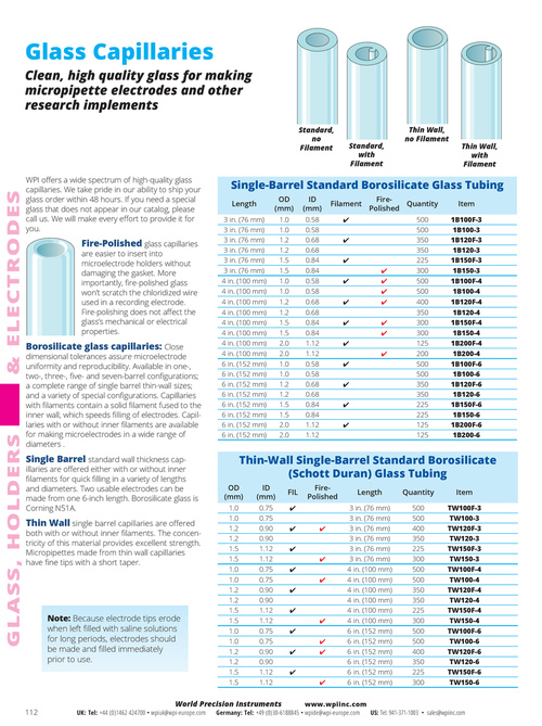 dimensional tolerances assure microelectrode uniformity and reproducibility. Available in one-, two-, three-, five- and seven-barrel configurations; a complete range of single barrel thin-wall sizes; and a variety of special configurations. Capillaries with filaments contain a solid filament fused to the inner wall, which speeds filling of electrodes. Capillaries with or without inner filaments are available for making microelectrodes in a wide range of diameters .