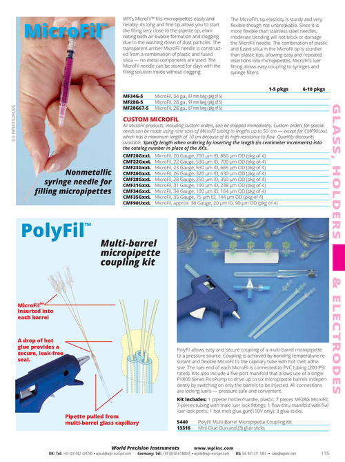 WPI’s MicroFil™ fills micropipettes easily and reliably. Its long and fine tip allows you to start the filling very close to the pipette tip, eliminating both air bubble formation and clogging due to the washing down of dust particles. The transparent amber MicroFil needle is constructed from a combination of plastic and fused silica — no metal components are used. The MicroFil needle can be stored for days with the filling solution inside without clogging.