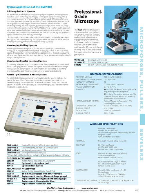 DMF1000-1 Complete Microforge, incl W30S-LED Microscope (110 v) DMF1000-2 Complete Microforge, incl W30S-LED Microscope (220 v) DMF1000-M1 Microforge without microscope (110v) DMF1000-M2 Microforge without microscope (220v) *Above DMF1000 microforges include 40X long working distance objective OPTIONAL ACCESSORIES 500329 25x Long Working Distance Objective, 5 mm 0.50NA 500292 Optional 15x Eyepiece (pair) 13142 Optional foot switch REPLACEMENT ACCESSORIES 800292 40x Long Working Distance Objective, 3 mm 0.25NA 503513 21 mm 10X Eyepiece with 100/10 reticle DMF1000-H5 Replacement heating filament (large gauge) MF200-H4 Replacement heating filament (small gauge) 75050 Replacement Micropipette Slide 75040 Replacement Filament Cable