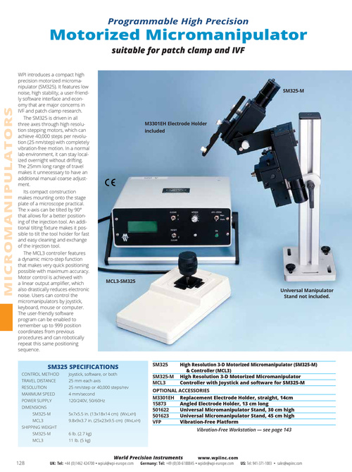 WPI introduces a compact high precision motorized micromanipulator (SM325). It features low noise, high stability, a user-friendly software interface and economy that are major concerns in IVF and patch clamp research. The SM325 is driven in all three axes through high resolution stepping motors, which can achieve 40,000 steps per revolution (25 nm/step) with completely vibration-free motion. In a normal lab environment, it can stay localized overnight without drifting. The 25mm long range of travel makes it unnecessary to have an additional manual coarse adjustment. Its compact construction makes mounting onto the stage plate of a microscope practical. The x-axis can be tilted by 90° that allows for a better positioning of the injection tool. An additional tilting fixture makes it possible to tilt the tool holder for fast and easy cleaning and exchange of the injection tool. The MCL3 controller features a dynamic micro-step function that makes very quick positioning possible with maximum accuracy. Motor control is achieved with a linear output amplifier, which also drastically reduces electronic noise. Users can control the micromanipulators by joystick, keyboard, mouse or computer. The user-friendly software program can be enabled to remember up to 999 position coordinates from previous procedures and can robotically repeat this same positioning sequence.