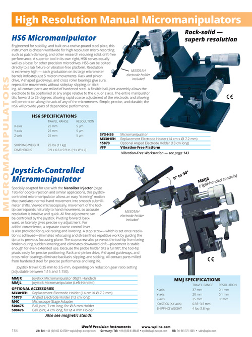 Specially adapted for use with the Nanoliter Injector (page 186) for oocyte injection and similar applications, this joystickcontrolled micromanipulator allows an easy “steering” motion that translates normal hand movement into smooth submillimeter shifts. Viewed microscopically, movement of the tooltip corresponds naturally to hand movement, so accurate M3301EH resolution is intuitive and quick. All fine adjustment can electrode holder be controlled by the joystick. Pivoting forward, backincluded ward, or laterally gives precise x-y adjustment. For added convenience, a separate coarse control lever is also provided for quick raising and lowering. A stop screw—which is set once resolution is achieved—eliminates refocusing and streamlines repetitive work by guiding the tip to its previous focussing plane. The stop screw also prevents the tool-tip from being broken during sudden lowering and eliminates downward drift—placement is stable enough for even extended use. Because the probe holder tilts a full 90°, the tool-tip pivots easily for precise positioning. Rack-and-pinion drive, V-shaped guideways, and cross roller bearings eliminate backlash, slipping, and sticking. All contact parts milled from hardened steel for precise performance and long life. Joystick travel: 0.35 mm to 3.5-mm, depending on reduction gear ratio setting (adjustable between 1:15 and 1:150). . MMJR MMJL Joystick Micromanipulator (Right-Handed) Joystick Micromanipulator (Left-Handed)