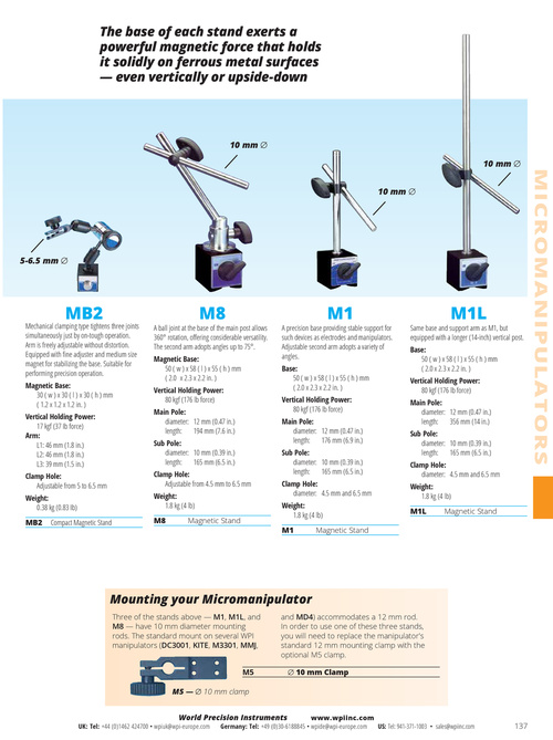 A precision base providing stable support for such devices as electrodes and manipulators. Adjustable second arm adopts a variety of angles . Base: 50 ( w ) x 58 ( l ) x 55 ( h ) mm ( 2 .0 x 2 .3 x 2 .2 in . ) Vertical Holding Power: 80 kgf (176 lb force) Main Pole: diameter: 12 mm (0 .47 in .) length: 176 mm (6 .9 in .) Sub Pole: diameter: 10 mm (0 .39 in .) length: 165 mm (6 .5 in .) Clamp Hole: diameter: 4 .5 mm and 6 .5 mm Weight: 1 .8 kg (4 lb) M1 Magnetic Stand