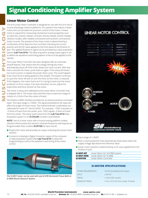 The SI-H Linear Motor Controller is designed for use with the SI-H line of muscle physiology research platforms. For systems that require a linear motor, this unit provides the precision control of the motor. A linear motor is required for measuring mechanical muscle properties such as slack-test, isotonic release, constant velocity release, stretch release, vibration studies, after-loaded contractions and eccentric contractions (intact muscle). The position of the linear motor is determined by a combination of the data from the controller indicating the current position and the DC value applied to the front panel at the Position In port. The applied Position In signal can be provided by a data acquisition system (Lab-Trax 8/16). The data acquisition analog output signal is set to define the waveform and timing pattern of force to be applied to the sample. The Linear Motor Controller has been designed with an automatic shutoff feature. That means that the voltage driving the motor automatically shuts off if the motor draws too much current. After less than a second, the motor cycles back on again. If the setup still draws too much current, it repeats the power down cycle. This could happen if too much force is being applied to the sample. The system continues to cycle the motor off and on until the force on the motor is reduced. If this happens, the motor hums as if it is trying to work, but the motor produces no force output. If an auto-shutdown occurs, adjust the experiment and force tension on the motor. The motor is setup and calibrated to the Linear Motor Controller that is shipped with it. The motor and controller have a maximum range of motion of ±3.5mm from the center of travel. The Position In BNC interface provides for an external position command input. The input range is ±10VDC. The signal presented at the input will affect the length of motor travel. The motor/controller combination are calibrated for travel of 1.0mm/2.0VDC. For example, +7VDC translates to +3.5mm of travel from the center, and –7VDC equals –3.5mm of travel from the center. This input could come from the Lab-Trax-8/16 Data Acquisition system or an SI-COLUB Constant Load Module. NOTE: Use of a linear motor with a muscle testing platform creates vibration which excites the sensor’s resonant frequency and requires an Programmable Filter module (SI-PF100) for best results. ●● Powers the motor and provides an output indicating the actual motor position ●● Connects to Analog to Digital Converter output of the computer or data acquisition system (like Lab-Trax-8/16) to allow the programming to control the waveform and timing of the motor control ●● Input range of ±10VDC ●● Over current protection that automatically shuts down when the supply voltage dips below the reference value ●● Linear motor position is determined by a DC value applied from the Position In port SI-MOT-MT SI-MOT-MKB SI-MOTDB Linear Motor for SI-HTBM system Linear Motor for SI-MKB Linear Motor Controller