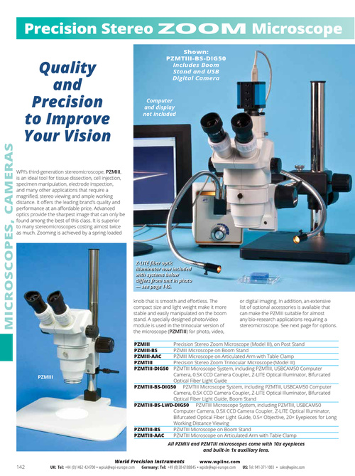 Z-LITE fiber optic illuminator now included with systems below differs from unit in photo — see page 145. knob that is smooth and effortless. The compact size and light weight make it more stable and easily manipulated on the boom stand. A specially designed photo/video module is used in the trinocular version of the microscope (PZMTIII) for photo, video, PZMIII PZMIII-BS PZMIII-AAC PZMTIII PZMTIII-DIG50 or digital imaging. In addition, an extensive list of optional accessories is available that can make the PZMIII suitable for almost any bio-research applications requiring a stereomicroscope. See next page for options.