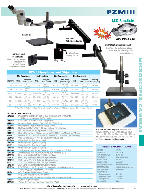 OPTIONAL ACCESSORIES 501352 PZMIII Binocular Body, pair of 10x eyepieces and eyeguards 13338 Ring Light Adapter NOT included 501353 Fan Post Stand with 76mm Focus Mount 502009 Universal Focus Mount, 76 mm ID for PZMIII Body 502004 Boom Stand (Heavy) without Focus Mount 502005 Ball Bearing Boom Stand (Heavy) without Focus Mount 504123 Post Extension for Heavy Boom Stand 502006 Boom Clamp Stand (Heavy) (requires 502009 Focus Mount for PZMIV) 502007 Articulated Arm with Table Clamp, without Focus Mount (50 cm clamp) 502163 Wall-Mount Plate, 6" × 6" (or 15.24 cm × 15.24 cm) 501369 Wide Field 10× Eyepieces (pair) 501370 Wide Field 15× Eyepieces (pair) 501371 Wide Field 20× Eyepieces (pair) 501372 Wide Field 25× Eyepieces (pair) 504128 10× Eyepiece with Reticle (matches 10× eyepiece on PZMIII) 504129 20× Eyepiece with Reticle (matches 20× eyepiece 501371) 501373 0.3× Long Working Distance Objective Lens 501375 0.5× Long Working Distance Objective Lens 501376 0.75× Long Working Distance Objective Lens 501377 1.5× Long Working Distance Objective Lens 501378 2.0× Long Working Distance Objective Lens 501379 PZMTIII Trinocular Body, pair of 10× eyepieces and eye guards 13338 Ring Light Adapter NOT included 501381 0.5× C-Mount CCD Camera Coupler 13338 Ring Light Adapter for PZMIII Series (included with all microscope configurations on previous page) 503051 Manual Stage for PZMIII 503102 76mm Rectangular Base Post Stand for PZMIII
