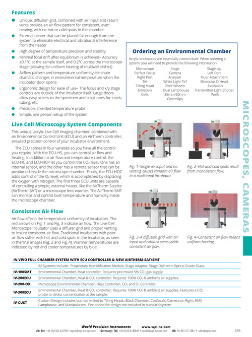 IN VIVO FULL CHAMBER SYSTEM WITH ECU CONTROLLER & NEW AIRTHERM-SAT/SMT All Systems Include: Proprietary Humidification Module, Stage Adaptor, Stage Dish with Optical Grade Glass. IV-100SMT IV-200ECU IV-200-OX IV-300ECU IV-CUST Environmental Chamber, Heat controller. Requires pre-mixed 5% CO2 gas supply Environmental Chamber, Heat & CO2 controller. Requires 100% CO2 & ambient air supplies. . Microscope Environmental Chamber, Heat Controller, CO2 and O2 Controller. Environmental Chamber, Heat & CO2 controller. Requires 100% CO2 & ambient air supplies. Features a CO2 probe to detect concentration at the sample. Custom Design includes but not limited to Tilting Heads, Black Chamber, Confocals, Camera on Right, HMX Lamphouse, and Manipulators. Fee added for design not included in standard system