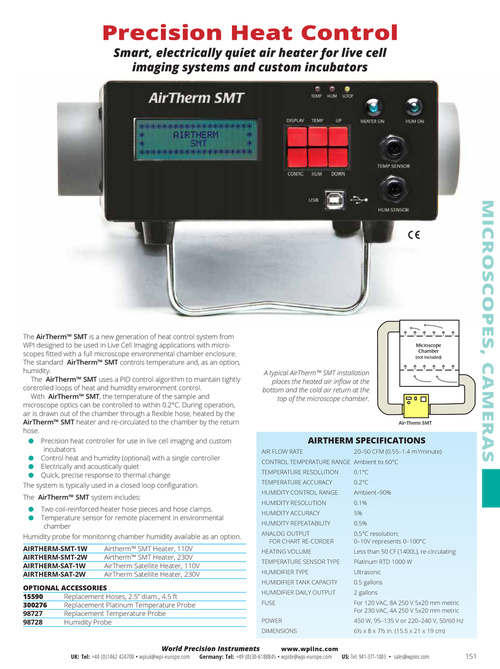 The AirTherm™ SMT is a new generation of heat control system from WPI designed to be used in Live Cell Imaging applications with microscopes fitted with a full microscope environmental chamber enclosure. The standard AirTherm™ SMT controls temperature and, as an option, humidity. The AirTherm™ SMT uses a PID control algorithm to maintain tightly controlled loops of heat and humidity environment control. With AirTherm™ SMT, the temperature of the sample and microscope optics can be controlled to within 0.2°C. During operation, air is drawn out of the chamber through a flexible hose, heated by the AirTherm™ SMT heater and re-circulated to the chamber by the return hose. ● Precision heat controller for use in live cell imaging and custom incubators ● Control heat and humidity (optional) with a single controller ● Electrically and acoustically quiet ● Quick, precise response to thermal change The system is typically used in a closed loop configuration. The AirTherm™ SMT system includes: Two coil-reinforced heater hose pieces and hose clamps. Temperature sensor for remote placement in environmental chamber Humidity probe for monitoring chamber humidity available as an option. ● ● AIRTHERM-SMT-1W AIRTHERM-SMT-2W AIRTHERM-SAT-1W AIRTHERM-SAT-2W Airtherm™ SMT Heater, 110V Airtherm™ SMT Heater, 230V AirTherm Satellite Heater, 110V AirTherm Satellite Heater, 230V