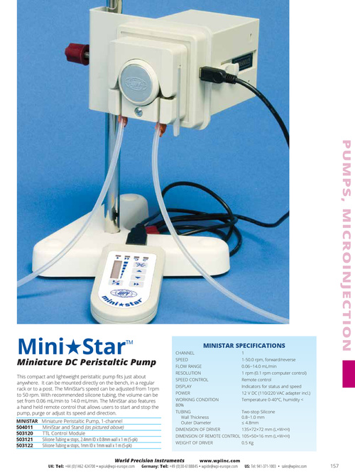This compact and lightweight peristaltic pump fits just about anywhere. It can be mounted directly on the bench, in a regular rack or to a post. The MiniStar’s speed can be adjusted from 1rpm to 50 rpm. With recommended silicone tubing, the volume can be set from 0.06 mL/min to 14.0 mL/min. The MiniStar also features a hand held remote control that allows users to start and stop the pump, purge or adjust its speed and direction. MINISTAR 504011 503120 503121 503122 Miniature Peristaltic Pump, 1-channel MiniStar and Stand (as pictured above) TTL Control Module Silicone Tubing w stops, 2 .4mm ID x 0 .8mm wall x 1 m (5-pk) Silicone Tubing w stops, 1mm ID x 1mm wall x 1 m (5-pk)