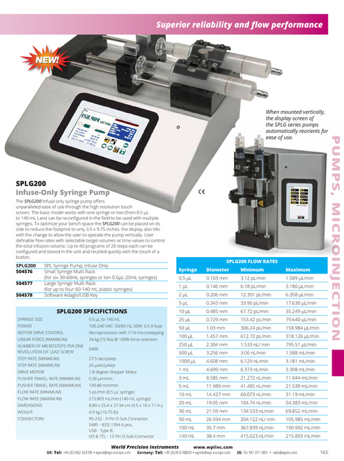 SPLG200 FLOW RATES Syringe 0.5 μL 1 μL 2 μL 5 μL 10 μL 25 μL 50 μL 100 μL 250 μL 500 μL 1000 μL 1 mL 3 mL 5 mL 10 mL 20 mL 30 mL 50 mL 100 mL 140 mL Diameter 0.103 mm 0.146 mm 0.206 mm 0.343 mm 0.485 mm 0.729 mm 1.03 mm 1.457 mm 2.304 mm 3.256 mm 4.608 mm 4.699 mm 8.585 mm 11.989 mm 14.427 mm 19.05 mm 21.59 mm 26.594 mm 35.7 mm 38.4 mm Minimum 3.12 pL/min 6.18 pL/min 12.301 pL/min 33.96 pL/min 67.72 pL/min 153.42 pL/min 306.24 pL/min 612.72 pL/min 1.533 nL/ min 3.06 nL/min 6.129 nL/min 6.373 nL/min 21.272 nL/min 41.485 nL/min 60.073 nL/min 104.74 nL/min 134.533 nL/min 204.122 nL/ min 367.839 nL/min 415.623 nL/min Maximum 1.589 μL/min 3.180 μL/min 6.358 μL/min 17.630 μL/min 35.249 μL/min 79.640 μL/min 158.984 μL/min 318.126 μL/min 795.51 μL/min 1.588 mL/min 3.181 mL/min 3.308 mL/min 11.044 mL/min 21.539 mL/min 31.19 mL/min 54.383 mL/min 69.852 mL/min 105.985 mL/min 190.992 mL/min 215.803 mL/min 165