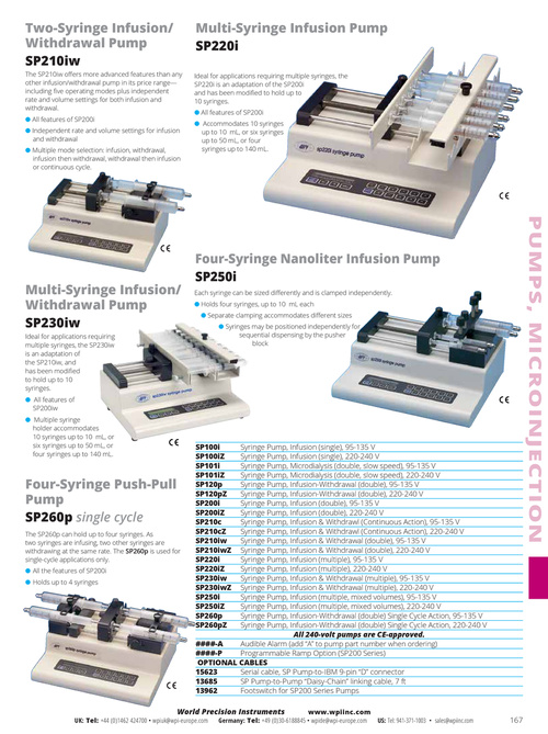 Syringe Pump, Infusion (single), 95-135 V Syringe Pump, Infusion (single), 220-240 V Syringe Pump, Microdialysis (double, slow speed), 95-135 V Syringe Pump, Microdialysis (double, slow speed), 220-240 V Syringe Pump, Infusion-Withdrawal (double), 95-135 V Syringe Pump, Infusion-Withdrawal (double), 220-240 V Syringe Pump, Infusion (double), 95-135 V Syringe Pump, Infusion (double), 220-240 V Syringe Pump, Infusion & Withdrawl (Continuous Action), 95-135 V Syringe Pump, Infusion & Withdrawl (Continuous Action), 220-240 V Syringe Pump, Infusion & Withdrawal (double), 95-135 V Syringe Pump, Infusion & Withdrawal (double), 220-240 V Syringe Pump, Infusion (multiple), 95-135 V Syringe Pump, Infusion (multiple), 220-240 V Syringe Pump, Infusion & Withdrawal (multiple), 95-135 V Syringe Pump, Infusion & Withdrawal (multiple), 220-240 V Syringe Pump, Infusion (multiple, mixed volumes), 95-135 V Syringe Pump, Infusion (multiple, mixed volumes), 220-240 V Syringe Pump, Infusion-Withdrawal (double) Single Cycle Action, 95-135 V Syringe Pump, Infusion-Withdrawal (double) Single Cycle Action, 220-240 V All 240-volt pumps are CE-approved. ####-A Audible Alarm (add “A” to pump part number when ordering) ####-P Programmable Ramp Option (SP200 Series) OPTIONAL CABLES 15623 Serial cable, SP Pump-to-IBM 9-pin “D” connector 13685 SP Pump-to-Pump “Daisy-Chain” linking cable, 7 ft 13962 Footswitch for SP200 Series Pumps