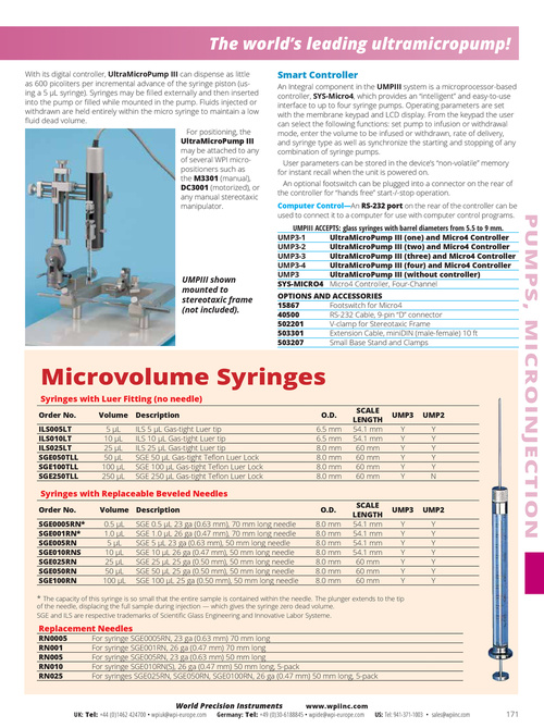 An Integral component in the UMPIII system is a microprocessor-based controller, SYS-Micro4, which provides an “intelligent” and easy-to-use interface to up to four syringe pumps. Operating parameters are set with the membrane keypad and LCD display. From the keypad the user can select the following functions: set pump to infusion or withdrawal mode, enter the volume to be infused or withdrawn, rate of delivery, and syringe type as well as synchronize the starting and stopping of any combination of syringe pumps. User parameters can be stored in the device’s “non-volatile” memory for instant recall when the unit is powered on. An optional footswitch can be plugged into a connector on the rear of the controller for “hands free” start-/-stop operation. Computer Control—An RS-232 port on the rear of the controller can be used to connect it to a computer for use with computer control programs. UMPIII ACCEPTS: glass syringes with barrel diameters from 5.5 to 9 mm. UMP3-1 UltraMicroPump III (one) and Micro4 Controller UMP3-2 UltraMicroPump III (two) and Micro4 Controller UMP3-3 UltraMicroPump III (three) and Micro4 Controller UMP3-4 UltraMicroPump III (four) and Micro4 Controller UMP3 UltraMicroPump III (without controller) SYS-MICRO4 Micro4 Controller, Four-Channel OPTIONS AND ACCESSORIES 15867 Footswitch for Micro4 40500 RS-232 Cable, 9-pin “D” connector 502201 V-clamp for Stereotaxic Frame 503301 Extension Cable, miniDIN (male-female) 10 ft 503207 Small Base Stand and Clamps