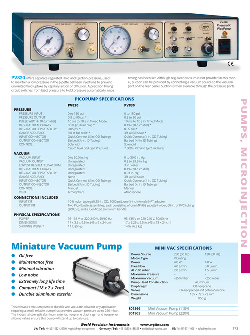This miniature vacuum pump is durable and accurate, ideal for any application requiring a small, reliable pump that provides vacuum pressure up to 250 mbar. The industrial-strength aluminum exterior, neoprene diaphragm and neoprene/ silicone valves ensure this pump will stand up to daily use. UK: Tel: +44 (0)1462 424700 • wpiuk@wpi-europe.com