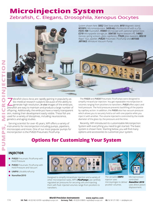 ebrafish (Danio Rerio) are rapidly gaining in popularity as bio-medical research subjects because of the ability to generate high resolution, in vivo images of the embryos. Zebrafish are easy to maintain and produce a large number of offspring. Additionally, the embryos have a nearly transparent skin, making their development easily visible. These fish are used for a variety of disciplines, including neuroscience, genetics and aging studies. Serving scientist for over 45 years, WPI offers a variety of instruments for microinjection including pumps, pipetters, microscopes and more. One of our most popular pumps for microinjection is the PV820 Pneumatic PicoPump.