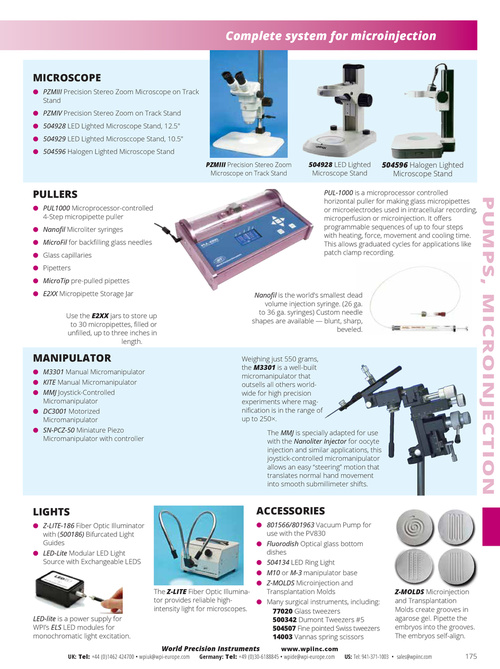 ● 801566/801963 Vacuum Pump for use with the PV830 ● Fluorodish Optical glass bottom dishes ● 504134 LED Ring Light ● M10 or M-3 manipulator base ● Z-MOLDS Microinjection and Transplantation Molds The Z-LITE Fiber Optic Illuminator provides reliable high● Many surgical instruments, including: intensity light for microscopes. 77020 Glass tweezers 500342 Dumont Tweezers #5 504507 Fine pointed Swiss tweezers 14003 Vannas spring scissors World Precision Instruments