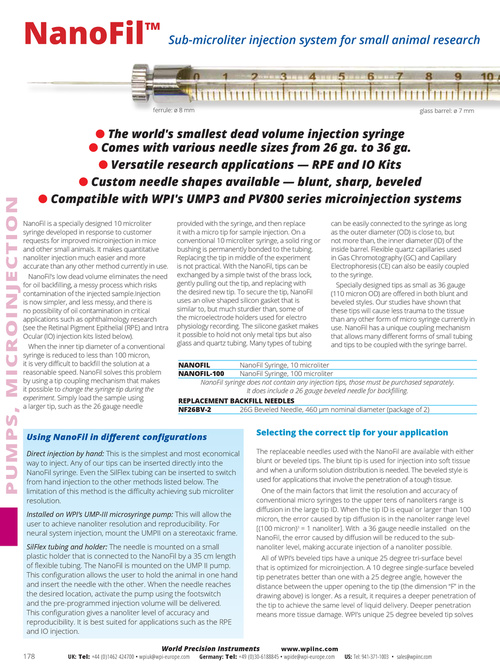 NANOFIL NanoFil Syringe, 10 microliter NANOFIL-100 NanoFil Syringe, 100 microliter NanoFil syringe does not contain any injection tips, those must be purchased separately. It does include a 26 gauge beveled needle for backfilling. REPLACEMENT BACKFILL NEEDLES NF26BV-2 26G Beveled Needle, 460 µm nominal diameter (package of 2)