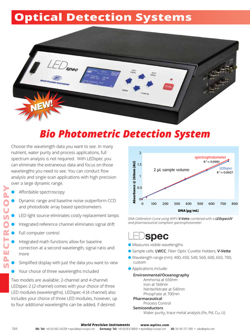 Choose the wavelength data you want to see. In many nutrient, water purity and process applications, full spectrum analysis is not required. With LEDspec you can eliminate the extraneous data and focus on those wavelengths you need to see. You can conduct flow analysis and single-scan applications with high precision over a large dynamic range. ● Affordable spectroscopy Dynamic range and baseline noise outperform CCD and photodiode array based spectrometers LED light source eliminates costly replacement lamps Integrated reference channel eliminates signal drift Full computer control Integrated math functions allow for baseline correction at a second wavelength, signal ratio and more Simplified display with just the data you want to view Your choice of three wavelengths included