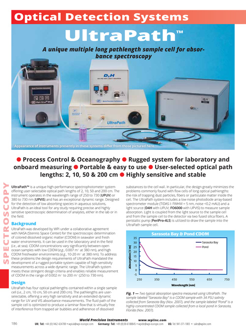 UltraPath was developed by WPI under a collaborative agreement with NASA (Stennis Space Center) for the spectroscopic determination of colored dissolved organic matter (CDOM) in seawater and fresh water environments. It can be used in the laboratory and in the field (i.e., at sea). CDOM concentrations vary significantly between open ocean samples with low CDOM (e.g., 0.007 m-1 at 380 nm), and high CDOM freshwater environments (e.g., 10-20 m-1 at 380 nm). To address these problems the design requirements of UltraPath mandated the development of a rugged portable system capable of high sensitivity measurements across a wide dynamic range. The UltraPath system meets these stringent design criteria and enables reliable measurement of CDOM in the range of 0.002 m-1 to 200 m-1 (250 to 730 nm).