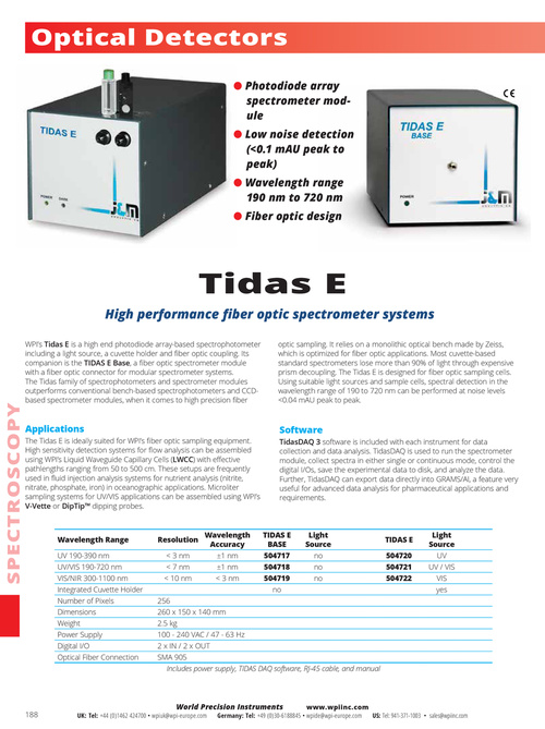 WPI’s Tidas E is a high end photodiode array-based spectrophotometer including a light source, a cuvette holder and fiber optic coupling. Its companion is the TIDAS E Base, a fiber optic spectrometer module with a fiber optic connector for modular spectrometer systems. The Tidas family of spectrophotometers and spectrometer modules outperforms conventional bench-based spectrophotometers and CCDbased spectrometer modules, when it comes to high precision fiber optic sampling. It relies on a monolithic optical bench made by Zeiss, which is optimized for fiber optic applications. Most cuvette-based standard spectrometers lose more than 90% of light through expensive prism decoupling. The Tidas E is designed for fiber optic sampling cells. Using suitable light sources and sample cells, spectral detection in the wavelength range of 190 to 720 nm can be performed at noise levels <0.04 mAU peak to peak.