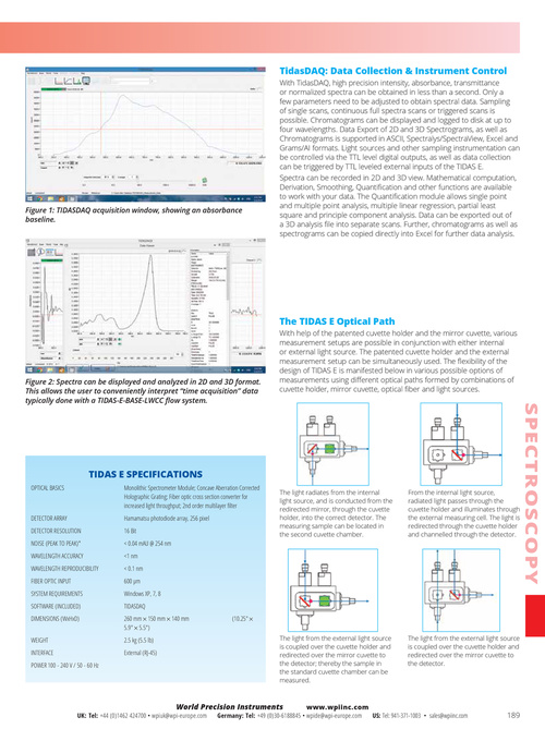 OPTICAL BASICS Monolithic Spectrometer Module; Concave Aberration Corrected Holographic Grating; Fiber optic cross section converter for increased light throughput; 2nd order multilayer filter Hamamatsu photodiode array, 256 pixel 16 Bit < 0 .04 mAU @ 254 nm <1 nm < 0 .1 nm 600 μm Windows XP, 7, 8 TIDASDAQ 260 mm × 150 mm × 140 mm 5 .9" × 5 .5") 2 .5 kg (5 .5 lb) External (RJ-45) (10 .25" × The light from the external light source is coupled over the cuvette holder and redirected over the mirror cuvette to the detector; thereby the sample in the standard cuvette chamber can be measured. The light from the external light source is coupled over the cuvette holder and redirected over the mirror cuvette to the detector. The light radiates from the internal light source, and is conducted from the redirected mirror, through the cuvette holder, into the correct detector. The measuring sample can be located in the second cuvette chamber. From the internal light source, radiated light passes through the cuvette holder and illuminates through the external measuring cell. The light is redirected through the cuvette holder and channelled through the detector.