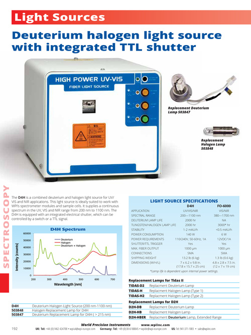 The D4H is a combined deuterium and halogen light source for UV/ VIS and NIR applications. This light source is ideally suited to work with WPI’s spectrometer modules and sample cells. It supplies a continuous spectrum in the UV, VIS and NIR range from 200 nm to 1100 nm. The D4H is equipped with an integrated electrical shutter, which can be controlled by a switch or a TTL signal.