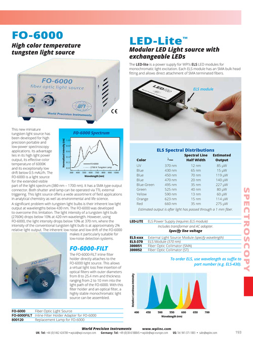 This new miniature FO-6000 Spectrum tungsten light source has been developed for high 1. 0 precision portable and 0. 8 low-power spectroscopy 0. 6 applications. Its advantage lies in its high light power 0. 4 output, its effective color 0. 2 FO-6000 temperature of 6000K 2760 K Tungsten Lamp 0. 0 and its exceptionally low 300 400 500 600 700 800 900 1000 drift below 0.5 mAU/h. The Wavelength [nm] FO-6000 is a light source for the extended visible part of the light spectrum (380 nm – 1700 nm). It has a SMA type output connector. Both shutter and lamp can be operated via TTL external triggering. This light source offers a wide assortment of field applications in analytical chemistry as well as environmental and life science. A significant problem with tungsten light bulbs is their inherent low light output at wavelengths below 430 nm. The FO-6000 was developed to overcome this limitation. The light intensity of a tungsten light bulb (2760K) drops below 10% at 420 nm wavelength. However, using FO-6000, the light intensity drops below 10% at 370 nm, where the intensity of the conventional tungsten light bulb is at approximately 2% relative light output. The inherent low noise and low drift of the FO-6000 makes it particularly suitable for low-noise detection systems.