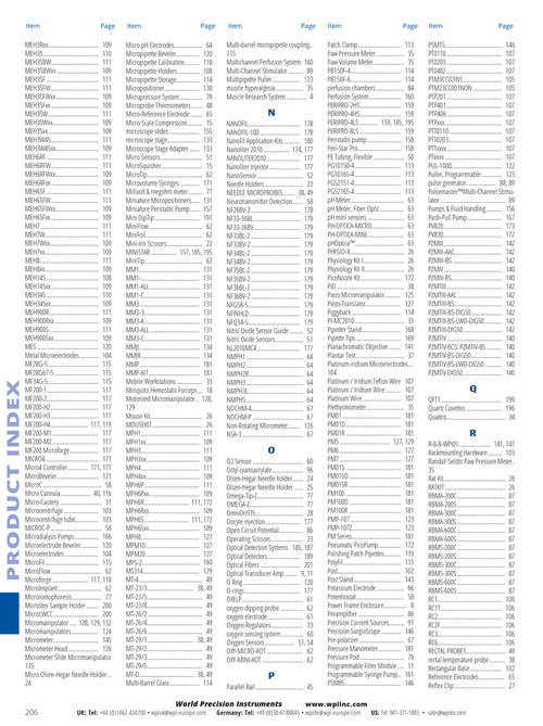 Patch Clamp . . . . . . . . . . . . . . . . . . . . . . . . . . . . 113 Paw Pressure Meter . . . . . . . . . . . . . . . . . . 35 Paw Volume Meter . . . . . . . . . . . . . . . . . . . . 35 PB150F-4 . . . . . . . . . . . . . . . . . . . . . . . . . . . . . . . . . 114 PB150F-6 . . . . . . . . . . . . . . . . . . . . . . . . . . . . . . . . . 114 perfusion chambers . . . . . . . . . . . . . . . . . . 84 Perfusion System . . . . . . . . . . . . . . . . . . . . . 160 PERIPRO-2HS . . . . . . . . . . . . . . . . . . . . . . . . . . . 159 PERIPRO-4HS . . . . . . . . . . . . . . . . . . . . . . . . . . . 159 PERIPRO-4LS . . . . . . . . . . . . 159, 185, 195 PERIPRO-8LS . . . . . . . . . . . . . . . . . . . . . . . . . . . 159 Peristaltic pump . . . . . . . . . . . . . . . . . . . . . . 158 Peri-Star Pro . . . . . . . . . . . . . . . . . . . . . . . . . . . . 158 PE Tubing, Flexible . . . . . . . . . . . . . . . . . . . . 50 PG10150-4 . . . . . . . . . . . . . . . . . . . . . . . . . . . . . . 113 PG10165-4 . . . . . . . . . . . . . . . . . . . . . . . . . . . . . . 113 PG52151-4 . . . . . . . . . . . . . . . . . . . . . . . . . . . . . . 113 PG52165-4 . . . . . . . . . . . . . . . . . . . . . . . . . . . . . . 113 pH Meter . . . . . . . . . . . . . . . . . . . . . . . . . . . . . . . . . . . 63 pH Meter, Fiber Optic . . . . . . . . . . . . . . . . 63 pH mini sensors . . . . . . . . . . . . . . . . . . . . . . . . 63 PH-OPTICA-MICRO . . . . . . . . . . . . . . . . . . . . . 63 PH-OPTICA-MINI . . . . . . . . . . . . . . . . . . . . . . . . 63 pHOptica™ . . . . . . . . . . . . . . . . . . . . . . . . . . . . . . . . 63 PHYSIO-II . . . . . . . . . . . . . . . . . . . . . . . . . . . . . . . . . . . 26 Physiology Kit I . . . . . . . . . . . . . . . . . . . . . . . . . . . 26 Physiology Kit II . . . . . . . . . . . . . . . . . . . . . . . . . . 26 PicoNozzle Kit . . . . . . . . . . . . . . . . . . . . . . . . . . 172 PID . . . . . . . . . . . . . . . . . . . . . . . . . . . . . . . . . . . . . . . . . . . . 38 Piezo Micromanipulator . . . . . . . . . . 125 Piezo-Translator . . . . . . . . . . . . . . . . . . . . . . . 127 Piggyback . . . . . . . . . . . . . . . . . . . . . . . . . . . . . . . . 114 PI-MC2010 . . . . . . . . . . . . . . . . . . . . . . . . . . . . . . . . 31 Pipetter Stand . . . . . . . . . . . . . . . . . . . . . . . . . 168 Pipette Tips . . . . . . . . . . . . . . . . . . . . . . . . . . . . . 169 Planachromatic Objective . . . . . . . . 141 Plantar Test . . . . . . . . . . . . . . . . . . . . . . . . . . . . . . . 37 Platinum-iridium Microelectrodes . . . 104 Platinum / Iridium Teflon Wire 107 Platinum / Iridium Wire . . . . . . . . . . 107 Platinum Wire . . . . . . . . . . . . . . . . . . . . . . . . . 107 Plethysmometer . . . . . . . . . . . . . . . . . . . . . . . . 35 PM01 . . . . . . . . . . . . . . . . . . . . . . . . . . . . . . . . . . . . . . 181 PM01D . . . . . . . . . . . . . . . . . . . . . . . . . . . . . . . . . . . . 181 PM01R . . . . . . . . . . . . . . . . . . . . . . . . . . . . . . . . . . . . 181 PM5 . . . . . . . . . . . . . . . . . . . . . . . . . . . . . . . . . 127, 129 PM6 . . . . . . . . . . . . . . . . . . . . . . . . . . . . . . . . . . . . . . . . 127 PM7 . . . . . . . . . . . . . . . . . . . . . . . . . . . . . . . . . . . . . . . . 127 PM015 . . . . . . . . . . . . . . . . . . . . . . . . . . . . . . . . . . . . 181 PM015D . . . . . . . . . . . . . . . . . . . . . . . . . . . . . . . . . . 181 PM015R . . . . . . . . . . . . . . . . . . . . . . . . . . . . . . . . . . 181 PM100 . . . . . . . . . . . . . . . . . . . . . . . . . . . . . . . . . . . . 181 PM100D . . . . . . . . . . . . . . . . . . . . . . . . . . . . . . . . . . 181 PM100R . . . . . . . . . . . . . . . . . . . . . . . . . . . . . . . . . . 181 PMP-107 . . . . . . . . . . . . . . . . . . . . . . . . . . . . . . . . . 123 PMP-107Z . . . . . . . . . . . . . . . . . . . . . . . . . . . . . . . . 123 PM Series . . . . . . . . . . . . . . . . . . . . . . . . . . . . . . . . 181 Pneumatic PicoPump . . . . . . . . . . . . . . . 172 Polishing Patch Pipettes . . . . . . . . . . . 119 PolyFil . . . . . . . . . . . . . . . . . . . . . . . . . . . . . . . . . . . . . . 115 Post . . . . . . . . . . . . . . . . . . . . . . . . . . . . . . . . . . . . . . . . . 102 Post Stand . . . . . . . . . . . . . . . . . . . . . . . . . . . . . . . 143 Potassium Electrode . . . . . . . . . . . . . . . . . . 66 Potentiostat . . . . . . . . . . . . . . . . . . . . . . . . . . . . . . . 58 Power Frame Enclosure . . . . . . . . . . . . . . . 8 Preamplifier . . . . . . . . . . . . . . . . . . . . . . . . . . . . . . 86 Precision Current Sources . . . . . . . . . . 91 Precision SurgioScope . . . . . . . . . . . . . 146 Pre-polarizer . . . . . . . . . . . . . . . . . . . . . . . . . . . . . 67 Pressure Manometer . . . . . . . . . . . . . . . 181 Pressure Pod . . . . . . . . . . . . . . . . . . . . . . . . . . . . . 79 Programmable Filter Module . . . . 11 Programmable Syringe Pump . . 161 PSMB5 . . . . . . . . . . . . . . . . . . . . . . . . . . . . . . . . . . . . 146