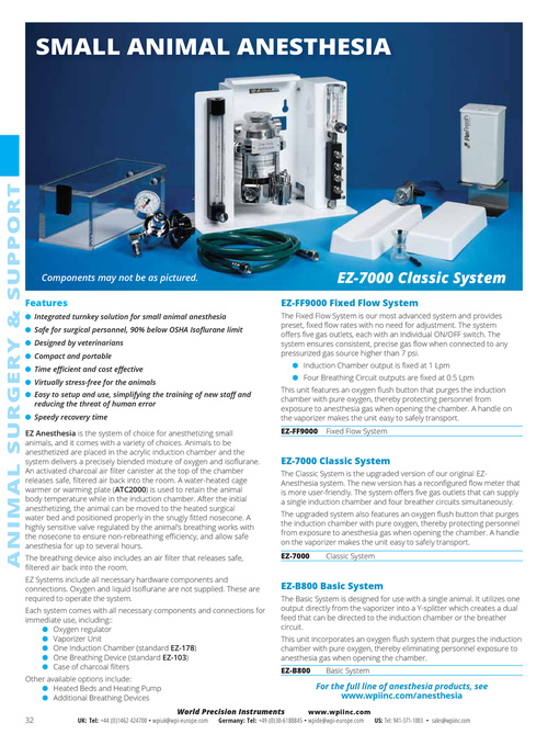 ● Integrated turnkey solution for small animal anesthesia ● Safe for surgical personnel, 90% below OSHA Isoflurane limit ● Designed by veterinarians ● Compact and portable ● Time efficient and cost effective ● Virtually stress-free for the animals ● Easy to setup and use, simplifying the training of new staff and reducing the threat of human error ● Speedy recovery time EZ Anesthesia is the system of choice for anesthetizing small animals, and it comes with a variety of choices. Animals to be anesthetized are placed in the acrylic induction chamber and the system delivers a precisely blended mixture of oxygen and isoflurane. An activated charcoal air filter canister at the top of the chamber releases safe, filtered air back into the room. A water-heated cage warmer or warming plate (ATC2000) is used to retain the animal body temperature while in the induction chamber. After the initial anesthetizing, the animal can be moved to the heated surgical water bed and positioned properly in the snugly fitted nosecone. A highly sensitive valve regulated by the animal’s breathing works with the nosecone to ensure non-rebreathing efficiency, and allow safe anesthesia for up to several hours. The breathing device also includes an air filter that releases safe, filtered air back into the room. EZ Systems include all necessary hardware components and connections. Oxygen and liquid Isoflurane are not supplied. These are required to operate the system. Each system comes with all necessary components and connections for immediate use, including:: ● Oxygen regulator ● Vaporizer Unit ● One Induction Chamber (standard EZ-178) ● One Breathing Device (standard EZ-103) ● Case of charcoal filters Other available options include: ● Heated Beds and Heating Pump ● Additional Breathing Devices 32
