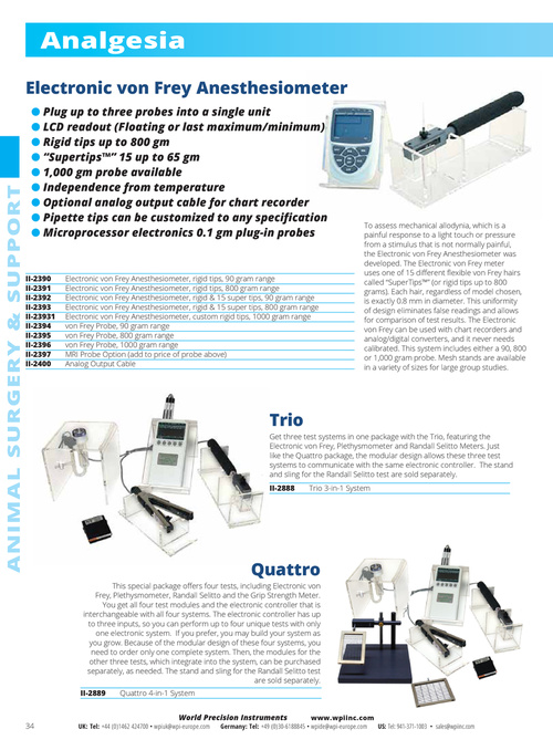 Electronic von Frey Anesthesiometer, rigid tips, 90 gram range Electronic von Frey Anesthesiometer, rigid tips, 800 gram range Electronic von Frey Anesthesiometer, rigid & 15 super tips, 90 gram range Electronic von Frey Anesthesiometer, rigid & 15 super tips, 800 gram range Electronic von Frey Anesthesiometer, custom rigid tips, 1000 gram range von Frey Probe, 90 gram range von Frey Probe, 800 gram range von Frey Probe, 1000 gram range MRI Probe Option (add to price of probe above) Analog Output Cable