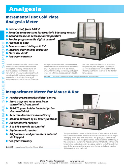● Heat or cool, from 0-70˚C ● Ramping temperatures for threshold & latency results ● Rapid increase or decrease in temperature ● Precise programmable digital control ● Printout of data ● Temperature stability is 0.1˚C ● Includes clear animal enclosure ● Plate size 4 x 8” ● Two-year warranty