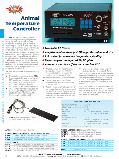 ATC2000 Animal Temperature Controller REQUIRED ACCESSORIES (select one sensor and one plate) 61800 Heating Plate with built-in RTD sensor, 15 x 25 cm 61830 Heating Plate with built-in RTD sensor, 15 x 10 cm 61840 Heating Plate with built-in RTD sensor for stereotaxic frame, 15x4 cm REPLACEMENTS 61824 RTD Rectal Temp Probe, 1.25 mm shaft diam., 2.5mm ball tip RET-2 TC Rat Rectal Temp Probe, 1 mm shaft diam., 3.2mm ball tip RET-3 TC Mouse Rectal Temp Probe, 1 mm shaft diam., 1.6mm ball tip 503573 Silicone Pad for ATC2000 (10 x 15 cm) 38