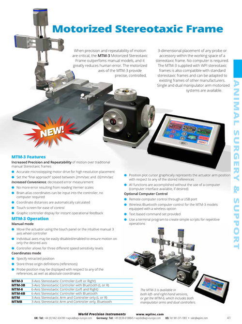 Manual mode ● Move the actuator using the touch panel or the intuitive manual 3 axis wheel controller ● Individual axes may be easily disabled/enabled to ensure motion on only the desired axis ● Controller allows for three different speed sensitivity levels Coordinates mode ● Specify retracted position ● Store three origin definitions (references) ● Probe position may be displayed with respect to any of the references, as well as absolute coordinates MTM-3 MTM-3B MTM-6 MTM-6B MTM MTMB 3-Axis Stereotaxtic Controller (Left or Right) 3-Axis Stereotaxtic Controller with Bluetooth (L or R) 6-Axis Stereotaxtic Controller (Left and Right) 6-Axis Stereotaxtic Controller with Bluetooth 3-Axis Stereotaxtic Arm and Controller only (L or R) 3-Axis Stereotactic Arm and Controller only, Bluetooth