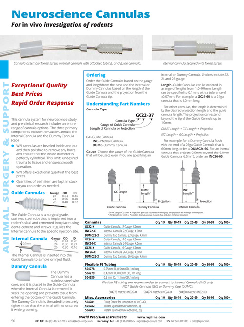 This cannula system for neuroscience study and pre-clinical research includes an entire range of cannula options. The three primary components include the Guide Cannula, the Internal Cannula and the Dummy Cannula (cap) ● WPI cannulas are beveled inside and out and then polished to remove any burrs and ensure that the inside diameter is perfectly cylindrical. This limits undesired trauma to tissue and ensures smooth operation. ● WPI offers exceptional quality at the best prices. ● Quantities of each item are kept in stock so you can order as needed.