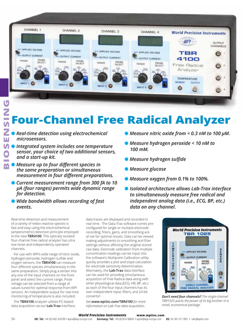 Real-time detection and measurement of a variety of redox-reactive species is fast and easy using the electrochemical (amperometric) detection principle employed in the new TBR4100. This optically isolated four-channel free radical analyzer has ultra low noise and independently operated channels.