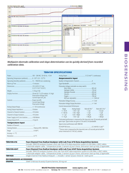 Power . . . . . . . . . . . . . . . . . . . . . . . . . . . . . . . . . . . . . . . . . . . . . . . . . . . . . . . .100 ~ 240 VAC, 50-60 Hz, <15 W Operating Temperature (ambient) . . . . . . . . . . . .0 - 50°C (32 - 122°F) Operating Humidity (ambient) . . . . . . . . . . . . . . . . . .15 – 70% RH non-condensing Warm up Time . . . . . . . . . . . . . . . . . . . . . . . . . . . . . . . . . . . . . . . . . .<5 minutes Dimensions . . . . . . . . . . . . . . . . . . . . . . . . . . . . . . . . . . . . . . . . . . . . . . .135 X 419 X 217 mm (5 .25” X 16 .5” X 8 .16”) Weight . . . . . . . . . . . . . . . . . . . . . . . . . . . . . . . . . . . . . . . . . . . . . . . . . . . . . . .1 .35 kg (3 lb) Display Functions . . . . . . . . . . . . . . . . . . . . . . . . . . . . . . . . . . . . . .18 mm (0 .7”) LCD readout, 4 .5 digit Polarization Voltage (mV) Current input (nA, μA) Controls . . . . . . . . . . . . . . . . . . . . . . . . . . . . . . . . . . . . . . . . . . . . . . . . . . . .Power (on/off) Current Input Range Polarization Voltage Analog Output Range . . . . . . . . . . . . . . . . . . . . . . . . . . . . . . . .+/- 10 V (continuous) Analog Output Impedance . . . . . . . . . . . . . . . . . . . . . . . .10 kohm Channel to Channel Isolation . . . . . . . . . . . . . . . . . . . .>10 Gohm Channel to Output Isolation . . . . . . . . . . . . . . . . . . . . . .>10 Gohm Power Supply to AC Line Isolation . . . . . . . . . . . . .>100 Mohm Analog Output Drift . . . . . . . . . . . . . . . . . . . . . . . . . . . . . . . . . . .<10 pA/h Temperature Input Number of Channels . . . . . . . . . . . . . . . . . . . . . . . . . . . . . . . . . . . . . . . 1 Sensing Element . . . . . . . . . . . . . . . . . . . . . . . . . . . . . . . . . . . . . . . . . . . . . . Platinum RTD, 1000 Ohm Range . . . . . . . . . . . . . . . . . . . . . . . . . . . . . . . . . . . . . . . . . . . . . . . . . . . . . . . . . 0-100°C Accuracy +/- 1°C Resolution . . . . . . . . . . . . . . . . . . . . . . . . . . . . . . . . . . . . . . . . . . . . . . . . . . . . . . . 0 .1°C TBR4100-416 Analog Output . . . . . . . . . . . . . . . . . . . . . . . . . . . . . . . . . . . . . . . . . . . . . . . . . 31 .25 mV/°C (continuous) Amperometric Input Number of Amperometric Channels . . . . . . . . . . . . . . . . . . . . . . . . . . . . . . . . . . .4 Signal Bandwidth . . . . . . . . . . . . . . . . . . . . . . . . . . . . . . . . . . . . . . . . . . . . . . . . . . . . . . . . . . . . . . .0-3 Hz Polarization Voltage (selectable via rotary switch) Nitric Oxide . . . . . . . . . . . . . . . . . . . . . . . . . . . . . . . . . . . . . . . . . . . . . . . . . . . . . . . . . .865 mV Hydrogen Sulfide . . . . . . . . . . . . . . . . . . . . . . . . . . . . . . . . . . . . . . . . . . . . . . . . .150 mV Hydrogen Peroxide . . . . . . . . . . . . . . . . . . . . . . . . . . . . . . . . . . . . . . . . . . . . . .450 mV Glucose . . . . . . . . . . . . . . . . . . . . . . . . . . . . . . . . . . . . . . . . . . . . . . . . . . . . . . . . . . . . . . . .600 mV Oxygen . . . . . . . . . . . . . . . . . . . . . . . . . . . . . . . . . . . . . . . . . . . . . . . . . . . . . . . . . . . . . . . . .700 mV ADJ (user adjustable) . . . . . . . . . . . . . . . . . . . . . . . . . . . . . . . . . . . . . . . . . . .+/- 2500 mV Polarization Voltage Accuracy . . . . . . . . . . . . . . . . . . . . . . . . . . . . . . . . . . . . . . . . . . . . . .+/- 5 mV Polarization Voltage Display Resolution . . . . . . . . . . . . . . . . . . . . . . . . . . . . . .+/- 1mV Current measurement Performance Range Analog Output Noise @ 3Hz * Noise @ 0 .3 Hz * +/- 10 nA 1 mV / 1 pA < 1 pA < 0 .3 pA +/- 100 nA 1 mV / 10pA < 7 pA < 3 pA +/- 1 μA 1 mV / 100pA < 70 pA < 30 pA +/- 10 μA 1 mV / 1μA < 700 pA < 300 pA *Instrument performance is measured as the (max-min) over 20 seconds period with open input. Typical values are given at 3 Hz and 0.3 Hz bandwidth. Typical sensor performance with TBR4100 ISO-NOPF100 noise . . . . . . . . . . . . . . . . . . . . . . . . . . . . . . . . . . . . . . . . . . . . . . . . . . . . . . . . . . . .0 .2 nM NO (<2 pA)** **Sensor noise is measured as the (max-min) over a 20 seconds period with the sensor immersed in 0 .1 M CuCl2 solution .