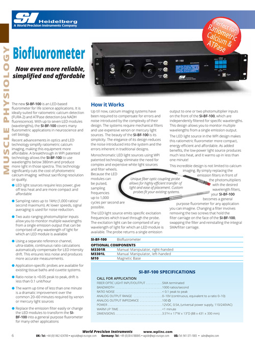 The new SI-BF-100 is an LED-based fluorometer for life science applications. It is ideally suited for ratiometric calcium detection (FURA-2) and ATPase detection (via NADH fluorescence). With up to seven LED modules (wavelengths), the SI-BF-100 covers many fluorometric applications in neuroscience and cell biology. Recent advancements in optics and LED technology simplify ratiometric calcium imaging, making this equipment more affordable. A breakthrough in WPI patented technology allows the SI-BF-100 to use wavelengths below 380nm and produce more light in those spectra. This technology significantly cuts the cost of photometric calcium imaging without sacrificing resolution or quality. ●● LED light sources require less power, give off less heat and are more compact and affordable ●● Sampling rates up to 1kHz (1,000 ratios/ second maximum). At lower speeds, signal averaging is used for noise reduction. ●● Two auto ranging photomultiplier inputs allow you to monitor multiple wavelengths from a single emission output that can be comprised of any wavelength of light for which an LED module is available ●● Using a separate reference channel, ultra-stable, continuous ratio calculations automatically compensate for LED intensity drift. This ensures less noise and produces more accurate measurements. ●● Application-specific probes are available for existing tissue baths and cuvette systems. ●● Ratio noise is <0.05 peak to peak, drift is less than 0.1 unit/hour ●● The warm up time of less than one minute is a dramatic improvement over the common 20–60 minutes required by xenon or mercury light sources ●● Replace the emission filter easily or change the LED modules to transform the SIBF-100 into a general purpose fluorometer for many other applications CALL FOR APPLICATION