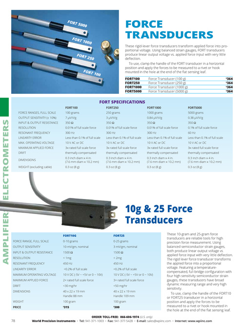 These rigid-lever force transducers transform applied force into proportional voltage. Using balanced strain gauges, FORT transducers produce linear output voltage vs. applied force input with very little deflection. To use, clamp the handle of the FORT transducer in a horizontal position and apply the forces to be measured to a rivet or hook mounted in the hole at the end of the flat sensing leaf. FORT100 FORT250 FORT1000 FORT5000 Force Transducer (100 g) Force Transducer (250 g) Force Transducer (1000 g) Force Transducer (5000 g) 364 364 $ 364 $ 364