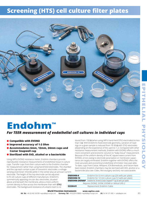 duced from 150 Ω (when using WPI’s hand-held STX2 electrodes) to less than 5 Ω. With Endohm’s fixed electrode geometry, variation of readings on a given sample is reduced from 10-30 Ω with STX2 electrodes (depending on the experience of the user) to 1-2. Compared with other resistance measurement methods, Endohm with EVOM2 offers a much more convenient and economic solution to “leaky tissue” measurement. Because of the uniform density of the AC square wave current from EVOM2, errors owing to electrode polarization or membrane capacitance are largely eliminated. Endohm together with EVOM2 offers the most accurate and economical endothelial ohmmeter now avail-able. To date, cups from Costar, Millipore, ICN Biomedicals, and Falcon have been tested. Endohm chambers may be sterilized with EtO, alcohol or a bactericide (also see: Cidex, Microsurgery section); not autoclavable.