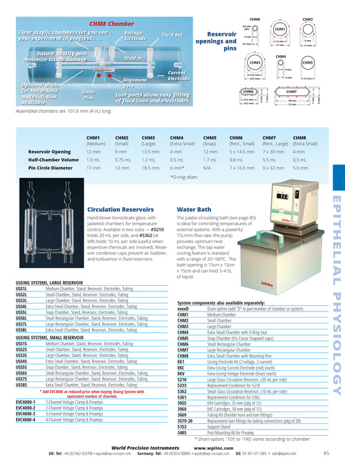 System components also available separately: xxxxD Drain option (add “D” to part number of chamber or system) CHM1 Medium Chamber CHM2 Small Chamber CHM3 Large Chamber CHM4 Extra Small Chamber with O-Ring Seal CHM5 Snap Chamber (fits Costar Snapwell cups) CHM6 Small Rectangular Chamber CHM7 Large Rectangular Chamber CHM8 Extra Small Chamber with Mounting Pins EK1 Ussing Electrode Kit (2 voltage, 2 current) EKC Extra Ussing Current Electrode (red) (each) EKV Extra Ussing Voltage Electrode (blue) (each) 5210 Large Glass Circulation Reservoir, (20 mL per side) 5233 Replacement Condenser for 5210 5362 Small Glass Circulation Reservoir, (10 mL per side) 5361 Replacement Condenser for 5362 3955 EKV Cartridges, 35 mm (pkg of 12) 3960 EKC Cartridges, 58 mm (pkg of 12) 3669 Tubing Kit (flexible hose and luer fittings) 3579-20 Replacement luer fittings for tubing connections (pkg of 20) 5153 Support Stand 3485 Post Mounting Kit for Preamp * Drain option, $105 to $140, varies according to chamber. 85