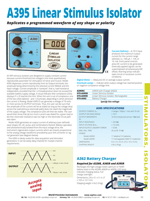 Current Delivery —A 10 V input produces the maximum output current for the current range selected, i.e., 100 µA, 1 mA, or 10 mA. Front panel controls allow DC current to be generated. Externally applied signals can be superimposed simultaneously (DC offset). Warning lamps indicate open circuit or excessive current conditions. Digital Meter — Measures DC or average output current. Overload Lamps — Indicate when output voltage has reached positive or negative compliance voltage limit. A395RC SYS-A395D SYS-A395R SYS-A362 A395R with Charger (A362) Linear Stimulus Isolator Linear Stimulus Isolator, Rechargeable Battery Charger Specify line voltage