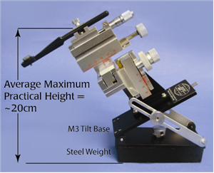 When the KITE is mounted on an an M-3 tilting base with the steel weight and tilted at 45°, the average maximum practical height from the tabletop to the center of the pivot point on the manipulator is approximately 20cm (see image).