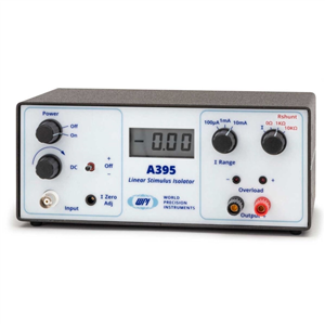 All WPI stimulus isolators are designed to supply constant current because current threshold (not voltage) is the most quantitatively reproducible parameter for stimulation of nerve and muscle. Model A395 dispenses current reproducibly from its Output terminals; the amplitude being determined by the selected current RANGE and the input voltage. Current amplitude is “constant”, that is, load resistance independent, provided that the I x R (load) product does not exceed the available battery supply voltage. A visual indicator (the compliance alarm) will display if I x R reaches this limit. Model A395 D can generate a voltage of 70 volts or more across its OUTPUT terminals. Thus, the user can be sure that the amplitude of the current will be as dialed as long as the voltage drop across the load (stimulus electrode path) does not reach the magnitude of the supply voltage. A visual indicator (the compliance LEDs) displays. The user would then know that (a) too much current was dialed for a given load or (b) inter-electrode resistance was too high or the electrode circuit path was open.